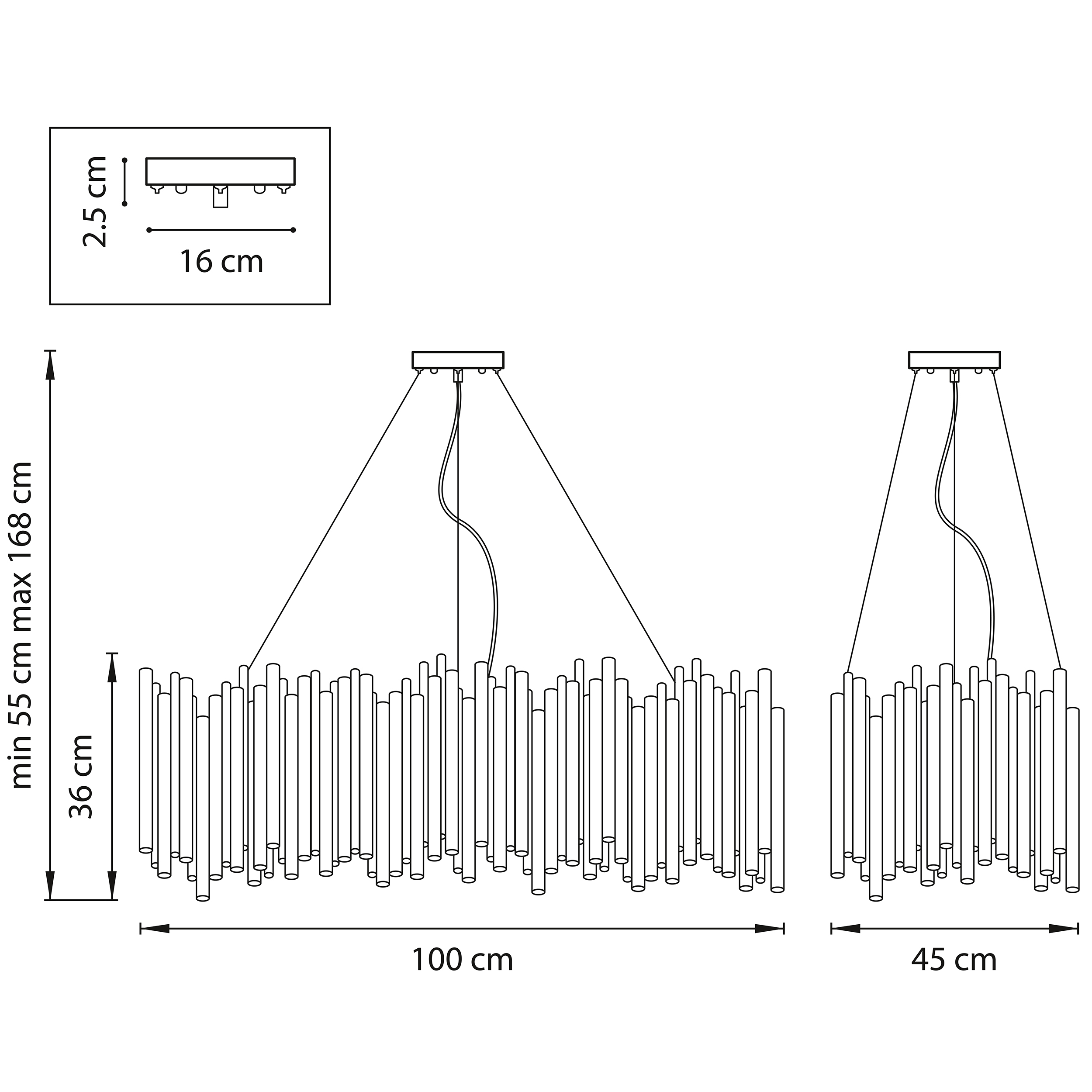 Высота min-max (см): 55-168; Ширина (см): 100*45; Вес (кг): 19,85; Кол-во ламп: 20хG9; Мощность max (W): 40; Цвет основания/цвет стекла или абажура: Черный;
