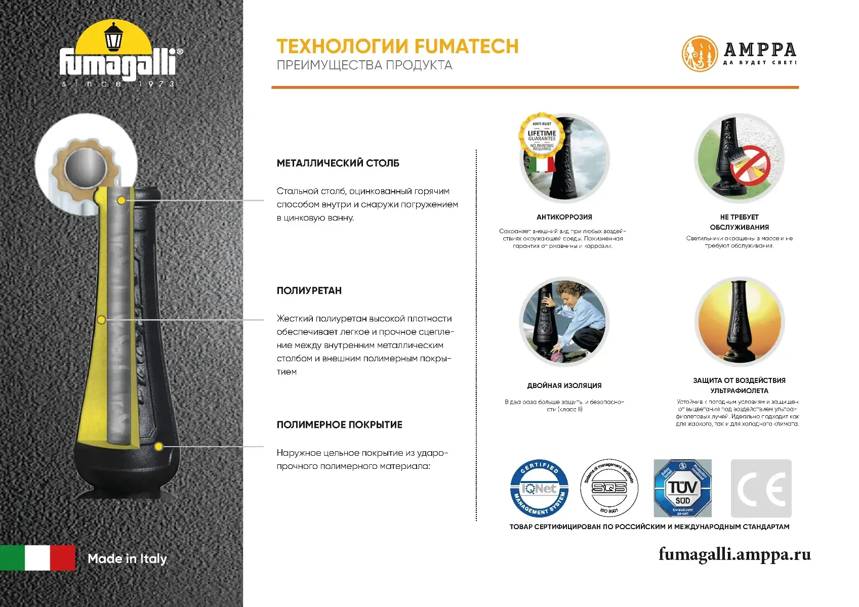 Парковый фонарь FUMAGALLI среднего размера серии RUT, модель NEBO OFIR/RUT 2L. Парковый фонарь с 2 светильниками, на консолях OFIR среднего размера, установленных на классическом столбе NEBO высотой 2,5 м (+высота фонарей на кронштейнах). Изготовлены в Италии, по уникальным технологиям "FUMATECH" из современного композитного полимера RESIN. Этот материал в 5 раз прочнее металла, не ржавеет, не окисляется, не выгорает на солнце, его не нужно красить. Все светильники пыле-влаго защищены по стандарту IP55 (Пылезащищенные, защита от водяных струй с любого направления). Рассеиватель выполнен из антивандального, не мутнеющего и не горючего PMMA (ПолиМетилМетаАкрилат). Срок службы светильника - не менее 20 лет. Температура использования от -60 до +90. В серии RUT есть садовые фонари в настенном (OFIR/RUT, MIRRA/RUT) подвесном (SICHEM/RUT) и наземном исполнении (IAFAET.R/RUT, ALOE.R/RUT, ARTU/RUT, GIGI/RUT, RICU/RUT, NEBO/OFIR/RUT 1L, NEBO/OFIR/ANNA 2L, TABOR/ADAM/RUT 3L) со столбами разной высоты, с разным количеством и конфигурацией голов. Консоли настенных фонарей и кронштейны светильников на столбах освещения могут устанавливаться в положение вверх и вниз. Столбы выше 150 см имеют в основе мощную стальную трубу с двойной оцинковкой. При заказе требуется выбрать цвет корпуса, цвет плафона. По стилю и дизайну серия уличных светильников RUT похожа на светильники большого размера серии NOEMI и малого размера серии ANNA . По размеру относится к средним парковым светильникам как серия CEFA и GLOBE 300.