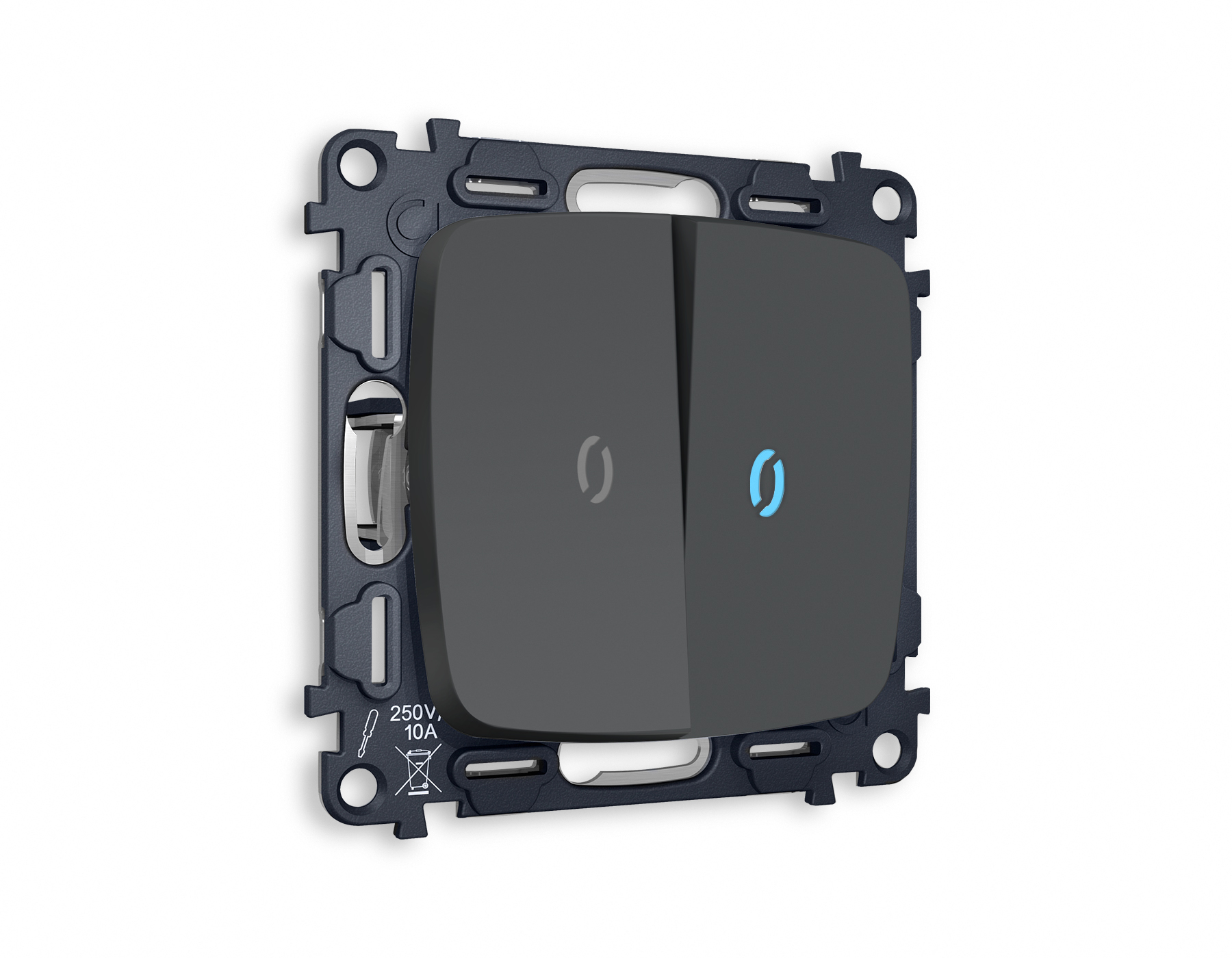 | Альтернативное название | Комплект механизма 2-клавишного проходного выключателя с подсветкой 10000K OMEGA MO904040 Графит мягкое касание QUANT |